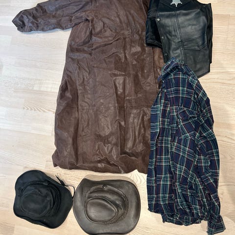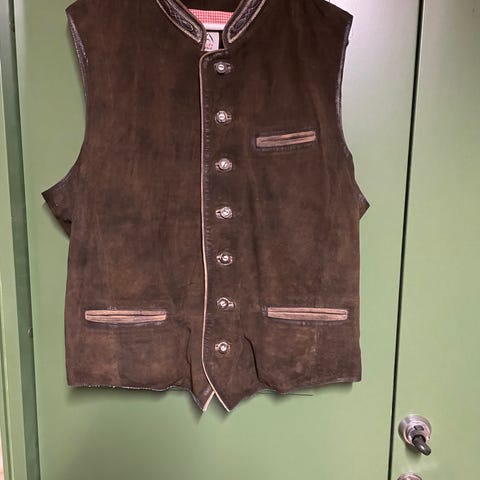 Skinnvest for herre i mørkebrun farge. Vesten har knappelukking foran og lommer på begge sider. Materialet er skinn, og den er designet for herrebruk, men kan også brukes av damer. Brukt kun noen få ganger.