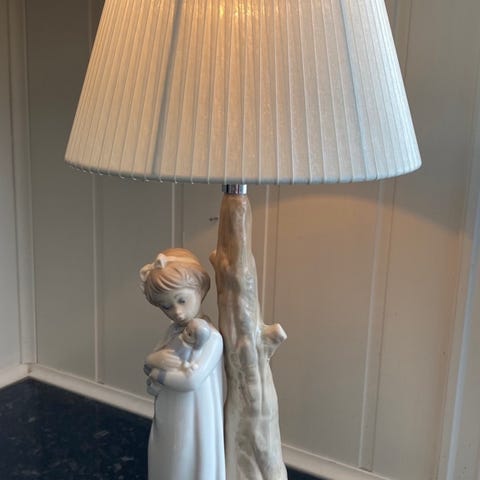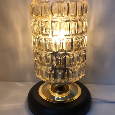 Gammel hjemmelaget bordlampe - ca 40-tallet ? - laget av det som antatt kalles knutebjørk. Flott sekskantet plate med lyse kanter, også sekskantet stamme med hhv. lyse og mørke felt. Litegrann avskalling i beisen. Trykkbryter på platen, nyere type ledning med jordet støpsel, også skiftet innvendige ledninger. Lampen inkl. pæreholderen er ca 27 cm høy, platen er 20 cm på det bredeste, selges uten lyspære. Stilig gammel sak 🤩