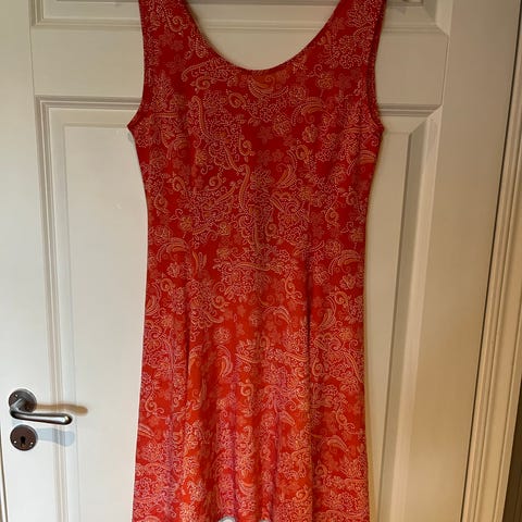 Fin og behagelig sommerkjole i deilig og mykt stoff. Kjolen er ikke brukt, hovedsaklig fordi utrigningen er for stor for meg. Størrelse S men passer nok best til M.