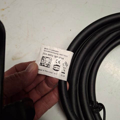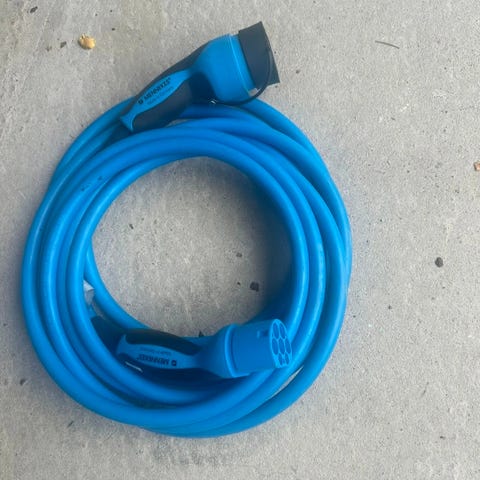 Kia Motors EV-ladekabel for elbil med kontrollenhet som viser status for strøm, lading og feil. Kabelen har standard ladekontakt for elbil og er utstyrt med indikatorlamper for power, charge og fault. Stikkontakt. Fungerer 👍🏽