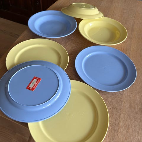 De er ikke helt runde, da de har et lite håndtak på den ene siden. Det gjør det enkelt å holde tallerkenen.