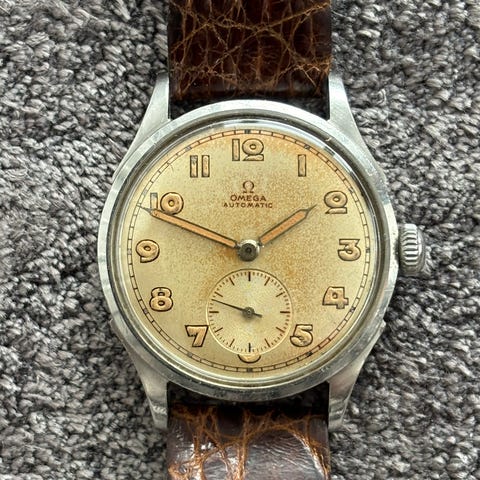 Dette er en tidløs Omega fra perioden før masseproduksjon, med solid urverk og design som aldri går av moten. Skiven har naturlig aldring (patina/crazing), noe som er normalt for alderen og ofte foretrukket av samlere.