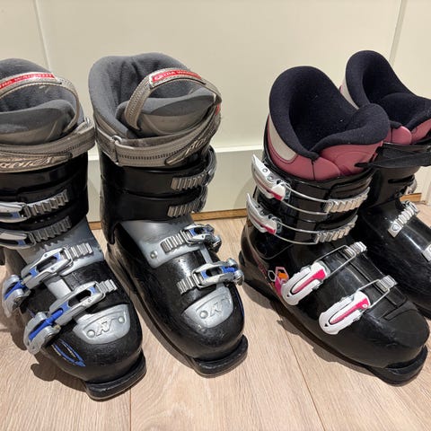 Nordica GP J alpinstøvler med størrelse 23-23,5 270 mm. Støvlene er svarte med blå og hvite detaljer.