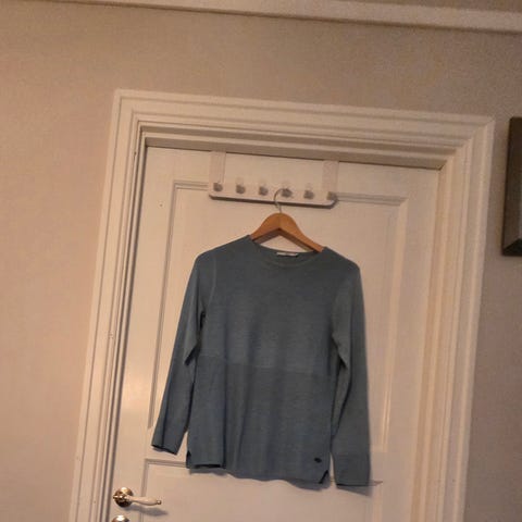 Marineblå genser med særdeles mye vidde i overkroppen. I bommuls-jersey med ermer i tettsittende ribbestrikk fra albuen og ned. Foto tatt på kropp som er 176 høy og str M+.