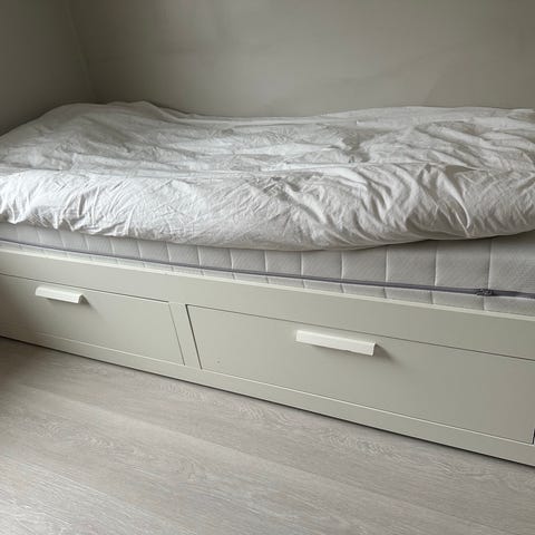 Sengen er pent brukt. Noe bruksmerker på rammen må regnes med som vist på bildet. Sengen vil bli demontert før henting. Bruksanvisning følger med. Selges uten madrass.