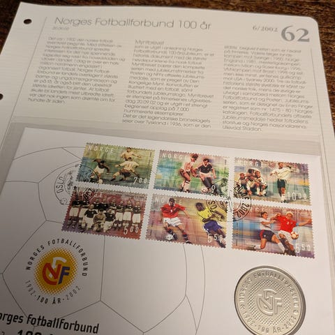 Frimerkealbum Norges Fotballforbund 100 år, inkludert frimerker og konvolutter med fotballrelaterte motiver. Inneholder bilder og tekst om Norges fotballhistorie, samt frimerker, miniark, FDC og historier.