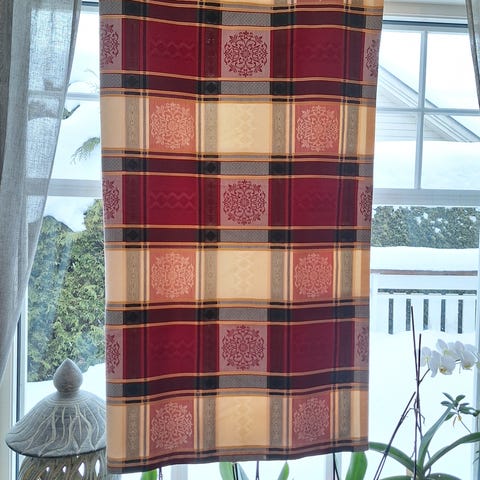 Hengt opp med klyper for å få et inntrykk av gardinene. Den er da hengt opp dobbelt.
