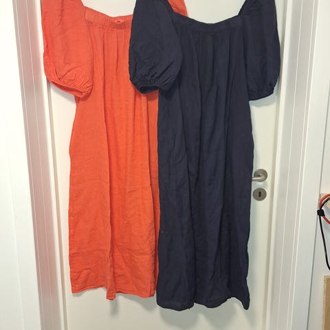 Nydelig kjole i 100% lin. Hvit med blått mønster. V-utringing, trompetermer.