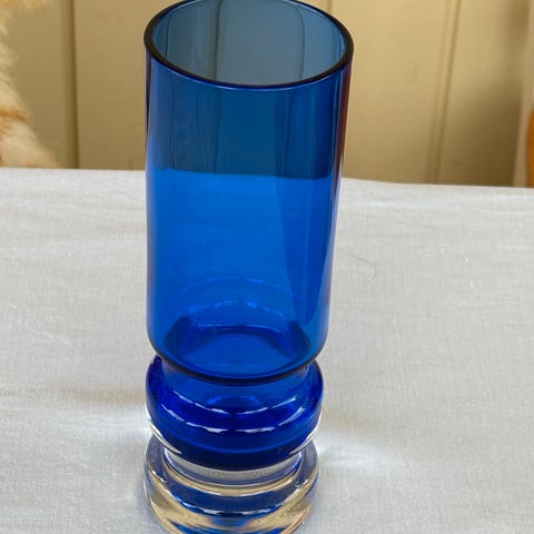 Glassvase i blått med dekorative mønstre i glasset. Vasen har en oval form og et unikt design med bølgende linjer og innlagte glassdetaljer