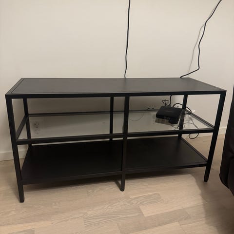 Svart tv-benk fra serien Bestå hos Ikea. Et lite bruksmerke på venstre side av benken, men som ikke syns når det står en tv på.