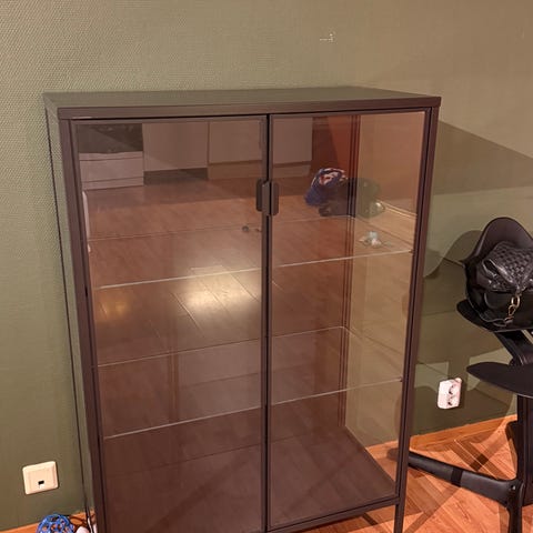 Solid Kallax hylle i sort med fire rom selges. Har skruehull og noe merke på siden(se bilde) ellers hel og grei