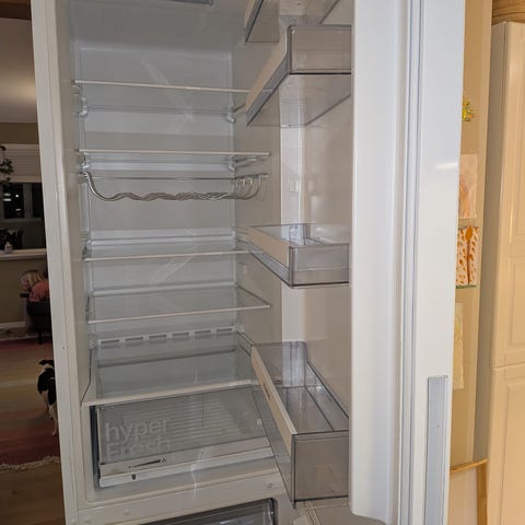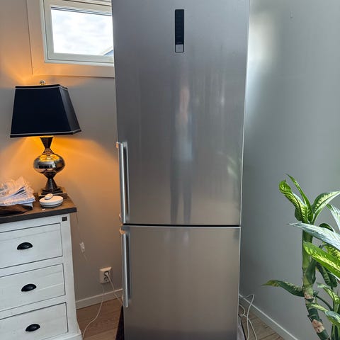 Siemens kombiskap med kjøleskap og fryser i ett. Kombiskapet har hvit farge og er utstyrt med flere hyller og skuffer for organisering av matvarer. Egnet for vanlig husholdningsbruk.funker som den skal
