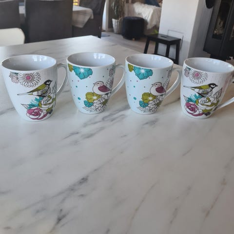 XL krus med leopard i jungel motiv. Og stor kopp med fugle og blomster motiv.