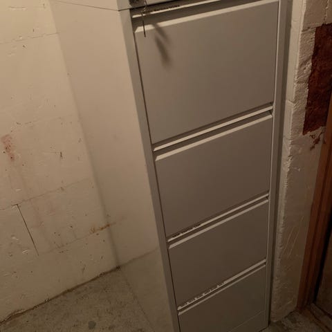 Arkiv skap med fire skuffer. Eldre modell men i pen stand.