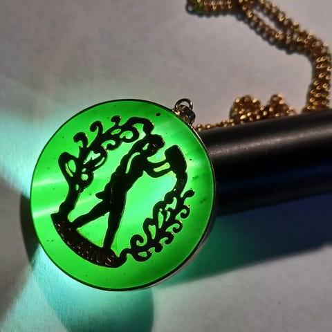Anheng i forgylt sølv og feilfri emalje med stjernetegnet fiskene av J.Tostrup med forgylt sølvkjede. Anhenget er ca 35 mm langt og 25 mm bredt, stemplet JT 925s. Sølvkjedet er i forgylt sølv og er også stemplet 925, det r ca 38 cm i omkrets.