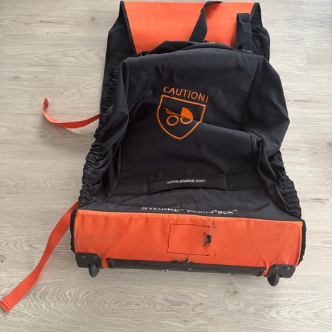 Stokke PramPack er en bag designet for oppbevaring og transport av barnevogner. Den har en svart og oransje fargekombinasjon, og er laget for å beskytte vognen under reise. Produktet har bærestropper og lukkemekanismer for enkel håndtering.