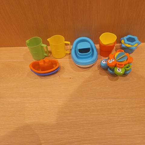 Aquaplay vannleke med blå beholder og fargerike tilbehør i gul, rød og grønn. Designet for barn og laget av plastmateriale. Kan brukes til lek i vann for å stimulere barnets motoriske ferdigheter og kreativitet.