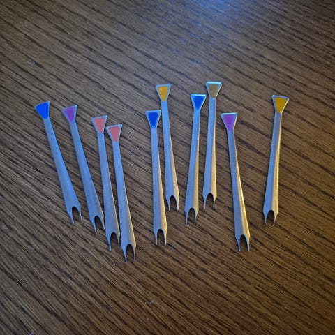 2 gafler, 2 skjeer og 1 teskje merket rustfri 18-8. Norstaal.