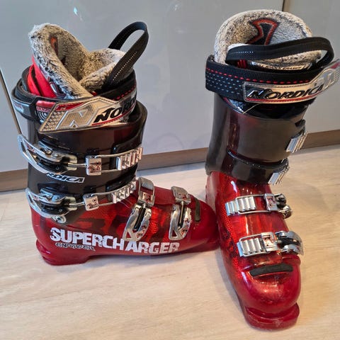 Head skistøvler i blå farge med fire spenner for justering. Designet for å gi støtte og komfort ved alpint skikjøring. Str 28.-28,5