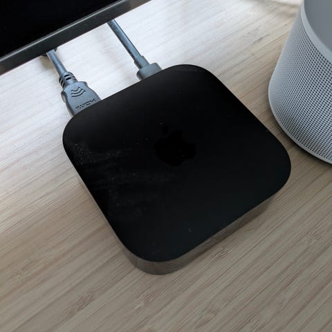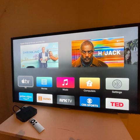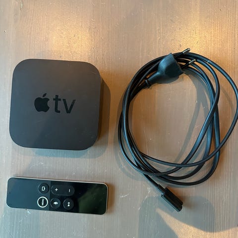 Apple TV 2 / 3 GEN 4K med fjernkontroll. En digital mediespiller for streaming av video og annet innhold via internett. Enheten har tilkoblinger for HDMI, strøm, Ethernet og optisk lyd.