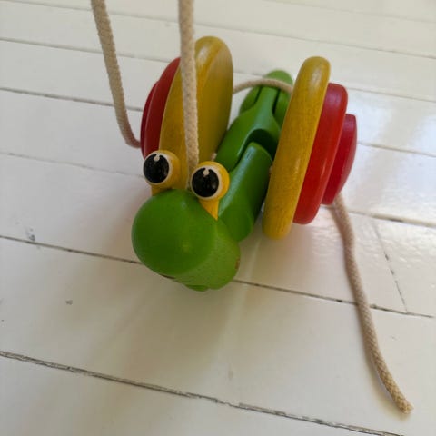 Når du drar denne morsomme trekrokodillen etter deg, beveger hode og hale seg opp og ned, og det gir også en klatter lyd. Fra 1 år.