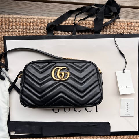Selger min Gucci Marmont Small skulderveske i svart skinn med gullfarget GG-logo.