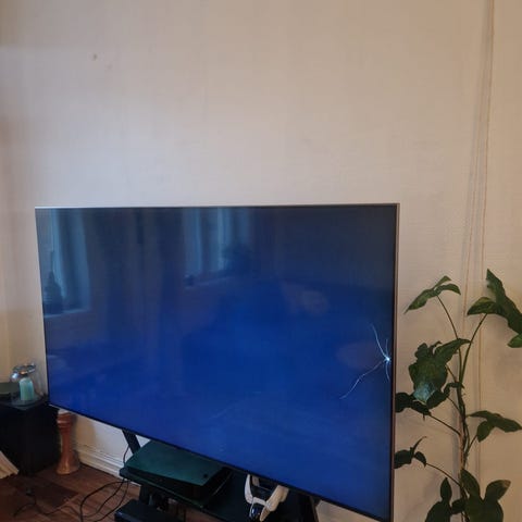 Skade på front slik at det er horisontal linje som vist på bilde. Ellers er tv'en veldig bra