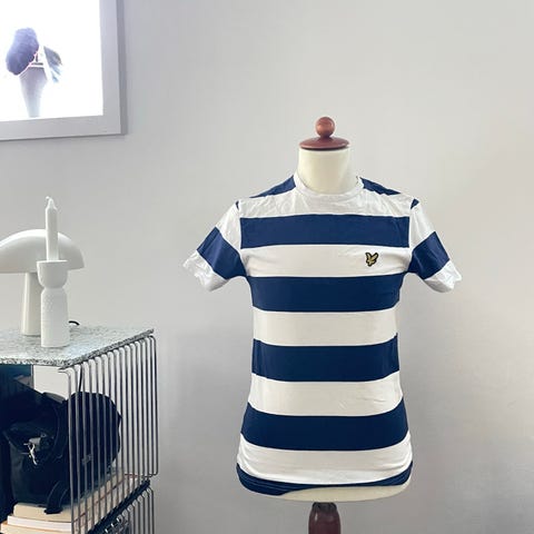 Lyle & Scott T-skjorte i størrelse 14/15år, laget av bomull. T-skjorten er hvit og har et lite logoemblem på brystet. Passer for menn.