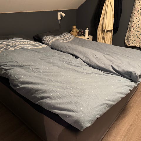 Selger en komfortabel og solid kontinentalseng i mørk grå tekstil. Sengen består av underdel og madrass, og gir god støtte og god komfort.