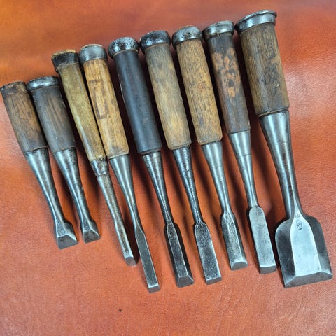 Verktøysett bestående av flere håndholdte verktøy med metallblad og trehåndtak. Verktøyene har ulike bladformer og størrelser, egnet for presisjonsarbeid som treskjæring eller lignende håndverksoppgaver.