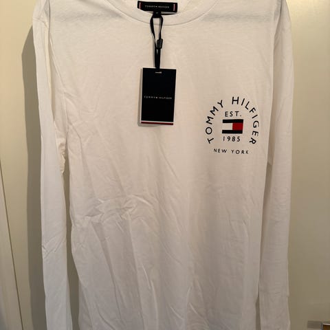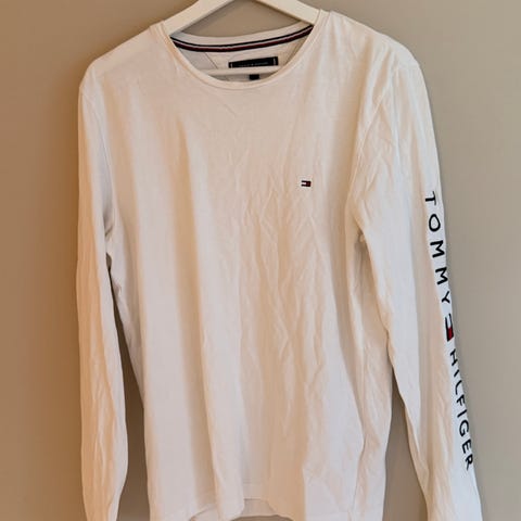 Tommy Hilfiger Slim Fit langermet T-skjorte i størrelse XS for herre. T-skjorten er hvit og laget av bomull. Den har rund hals og et trykt logo-design på brystet. Liten svart flekk på venstre siden av brystet går mest sannsynlig vekk i vask.