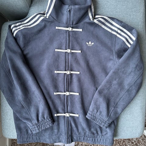 Adidas jakke i størrelse L. Jakken er svart med hvite detaljer og har to lommer med glidelås. I god stand.