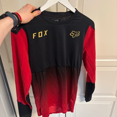 Fox 180 sykkeltrøye i størrelse S. Trøyen er rød med svarte detaljer og er designet for unisex bruk. Egnet for ulike sportsaktiviteter. Brukt til downhill.