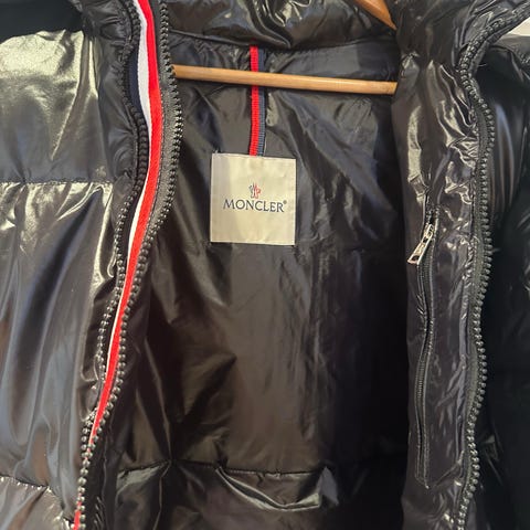Moncler vinterjakke for dame i størrelse M. Jakken er svart og laget av dunmateriale, designet for å gi varme i kalde værforhold.