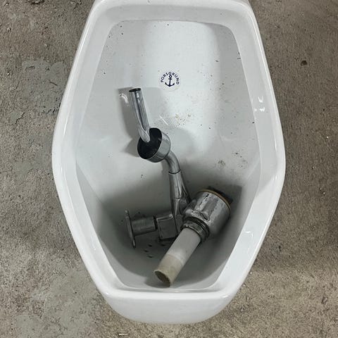 Urinbeholder i hvit keramikk med tilhørende spyleventil og avløpsrør. Produktet er beregnet for veggmontering i sanitæranlegg. Materialet er slitesterkt og lett å rengjøre.