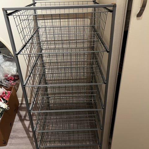 2 stk oppbevarings seksjoner med tilhørende kurver og skooppbevaring følger med. selges samlet. merke norscan. mangler ett lite ben/knott på den ene, men kan brukes møbelknott eller kjøpes til et ben.