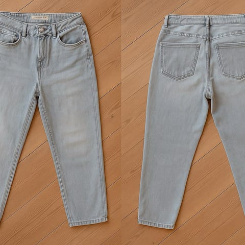 Den mørkeste blå buksen har muligens en lysere "stripe" foran på det ene beinet, se bilde 4. Er usikker på om dette bare er støv/brett, noe annet og om det går av i vask. Uansett er det veldig lite synlig. Ellers ser jeg ingen feil/skader på buksene.