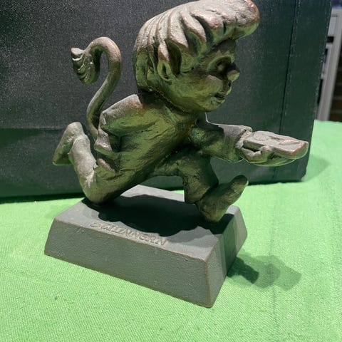 BRONSESKULPTUR. Skulptur av et lite troll med tekst på platen: "Stifinner`n". Vekt 1.9 kg
