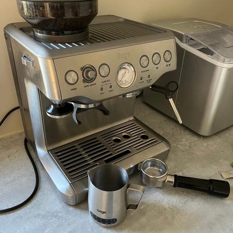 Rustfritt stål med innebygd kaffekvern, trykkmåler og dampstav for melkeskumming.