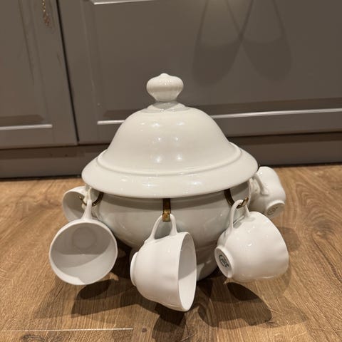 Alt går i hvitt med blå dekor, klassisk og tidstypisk stil. Passer perfekt i landlig kjøkken, hytte eller som dekor.