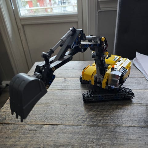 LEGO Technic gravemaskin med bevegelige deler og hjul. Byggesett som gir mulighet for å konstruere en fungerende gravemaskinmodell.