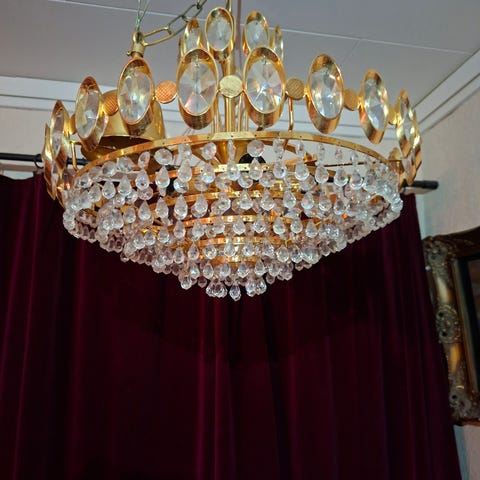 Stor, flott krystall-lysekrone. Høyde 90. Diameter 80. Det er noen løse deler til denne som følger med.
