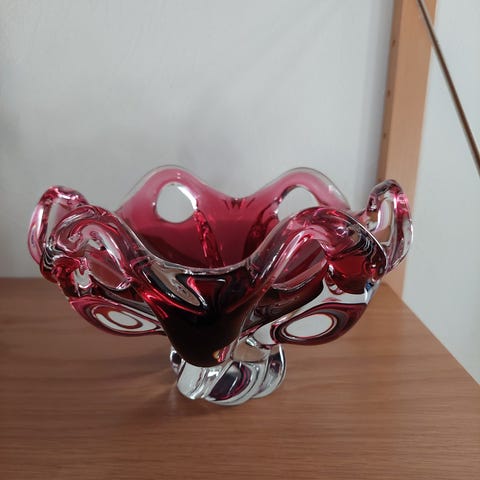Selger nydelig skål/askebeger i rødt glass med konsentriske sirkler/bobler. Skålen ligner på Svensk Aseda glassverk ca fra 1970- tallet. Veldig tung og solid. Skålen er i veldig fin stand, uten skader minimalt med slitasje, blank og fin. Størrelse Ø: ca 14 cm, H: 8 cm.