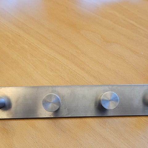 6 knagger. Mål er 39 cm lengde, 11 cm høyde og 5 cm dybde.