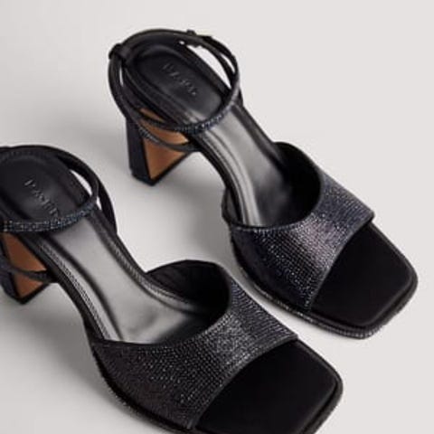 NA-KD hæler i størrelse 39 med svart farge. Skoene har åpen tå, remmer over foten og rundt ankelen, samt en blokkhæl. Passer til formelle og uformelle anledninger.
