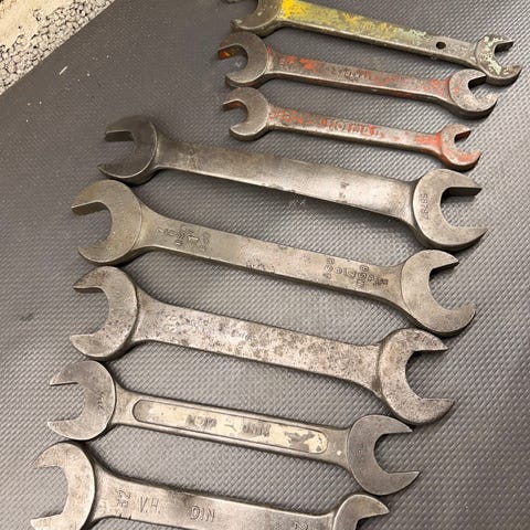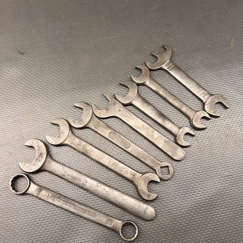Settet består av både tomme- og metrisk dimensjonerte nøkler, inkludert større dimensjoner. Noe normal bruksslitasje og enkelte overflatemerker forekommer, blant annet synlig misfarging på ringnøkkelen, men ingen sprekker eller avrundede kjefter. Alt er fullt brukbart.