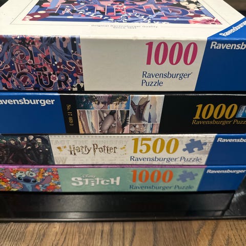Selger puslespill med 1000, 1500 biter og 3000 biter.