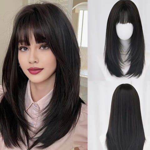 24-tommers lagdelt syntetisk parykk med mekanisme i brun, med langt, rett syntetisk hår og side-svept pannelugg. Denne varmebestandige, ikke-lace syntetiske parykken er egnet for styling og farging.