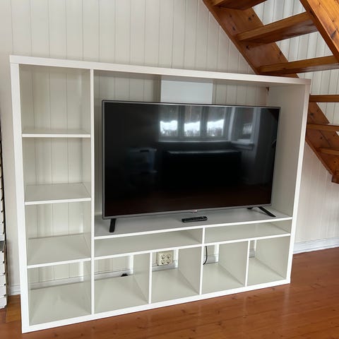 Noen bruksmerker, men hel og pen. Følger med en brun, to hvite og tre sorte oppbevaringsbokser i stoff