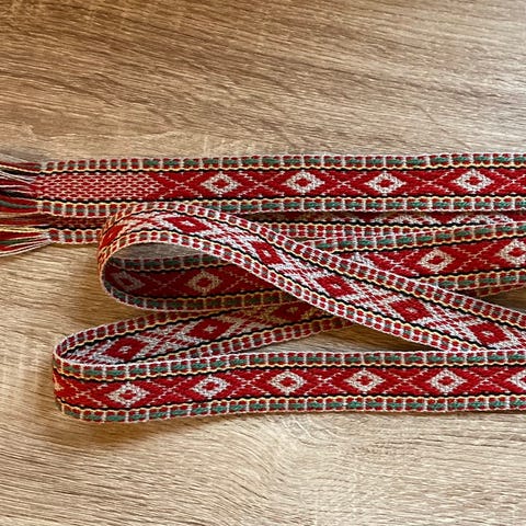 Håndvevd bunadsbelte i flere forskjellige fargekombinasjoner.